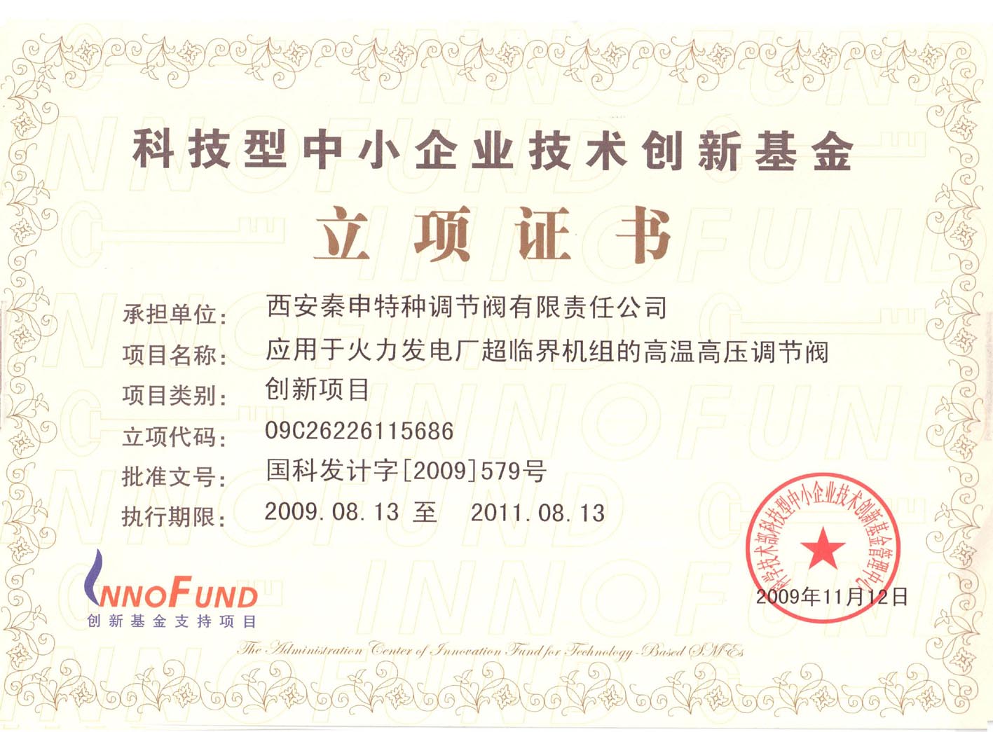 我公司《應(yīng)用于火電廠超臨界機(jī)組的高溫高壓調(diào)節(jié)閥》項(xiàng)目,于二〇〇九年底榮獲國家科技部技術(shù)創(chuàng)新基金的重點(diǎn)支持,獲得了近百萬元資金的無償資助。