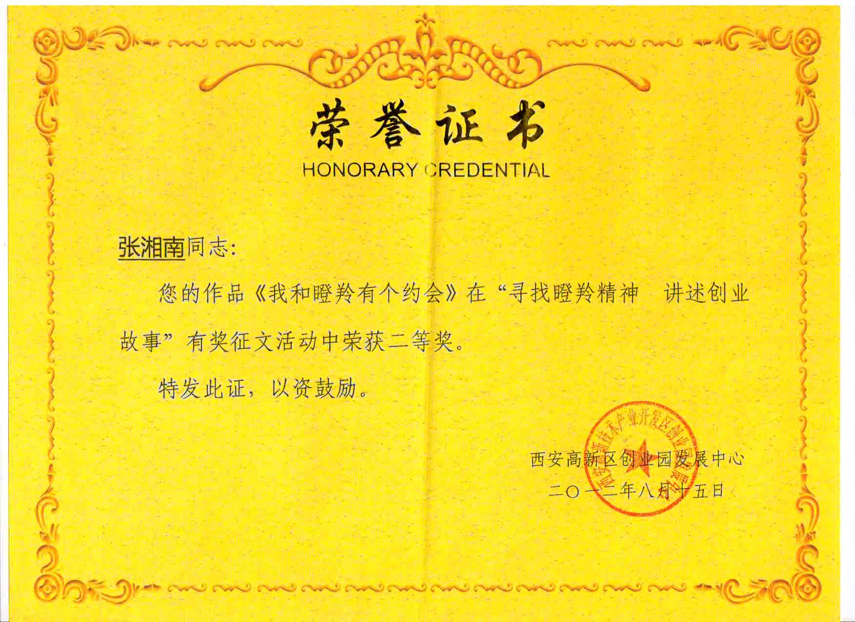 2012年6月,西安高新區(qū)創(chuàng)業(yè)研發(fā)園發(fā)展中心舉辦了以“尋找瞪羚精神,講述創(chuàng)業(yè)故事”為主題的有獎?wù)魑幕顒?,總?jīng)理張湘南以其作品《我和瞪羚有個約會》榮獲二等獎,劉丹作品《奔跑的瞪羚》榮獲優(yōu)秀獎。