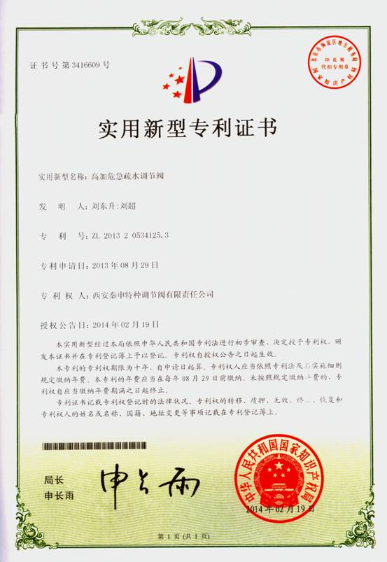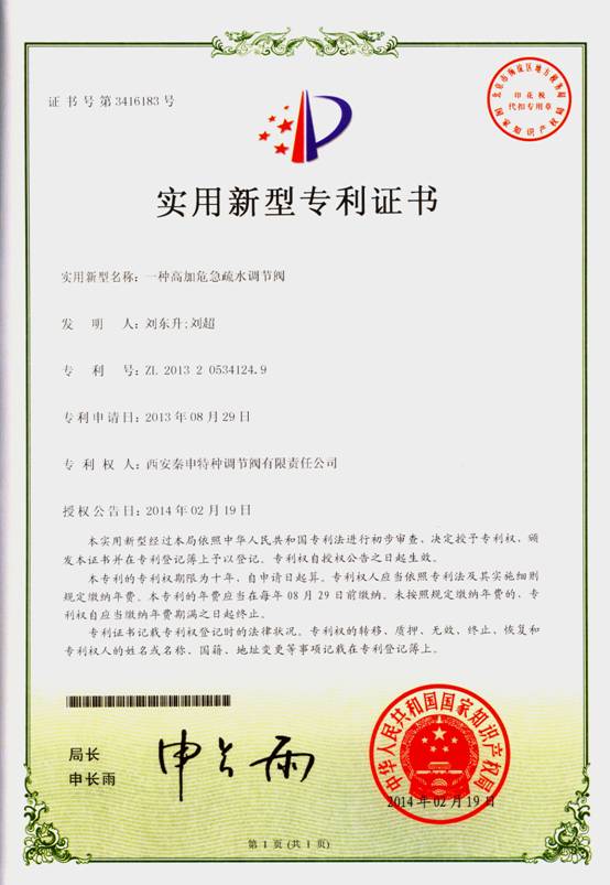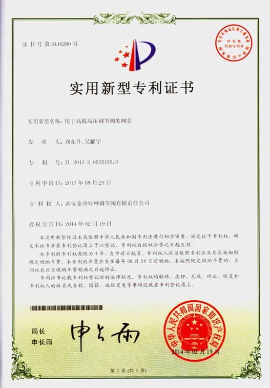 同時(shí),公司注重對自主知識產(chǎn)權(quán)的保護(hù),截至目前,我公司有實(shí)用新型專利證書11項(xiàng),發(fā)明專利1項(xiàng)。產(chǎn)品專利的持續(xù)獲得,標(biāo)志著公司科技實(shí)力和核心競爭力在穩(wěn)步提升,有利于公司形成持續(xù)創(chuàng)新機(jī)制,充分發(fā)揮公司在行業(yè)內(nèi)的技術(shù)領(lǐng)先優(yōu)勢,進(jìn)一步確立“秦申”品牌在國內(nèi)調(diào)節(jié)閥市場的地位。