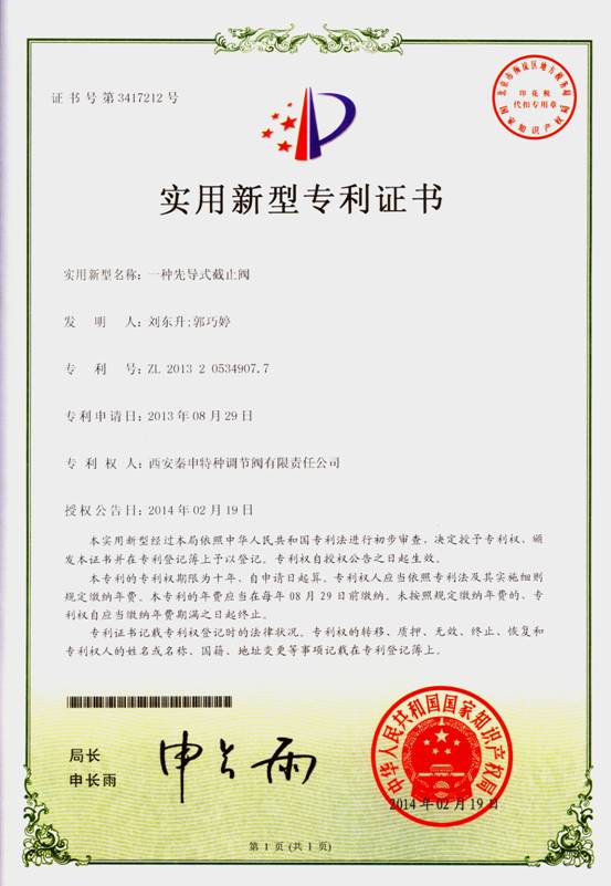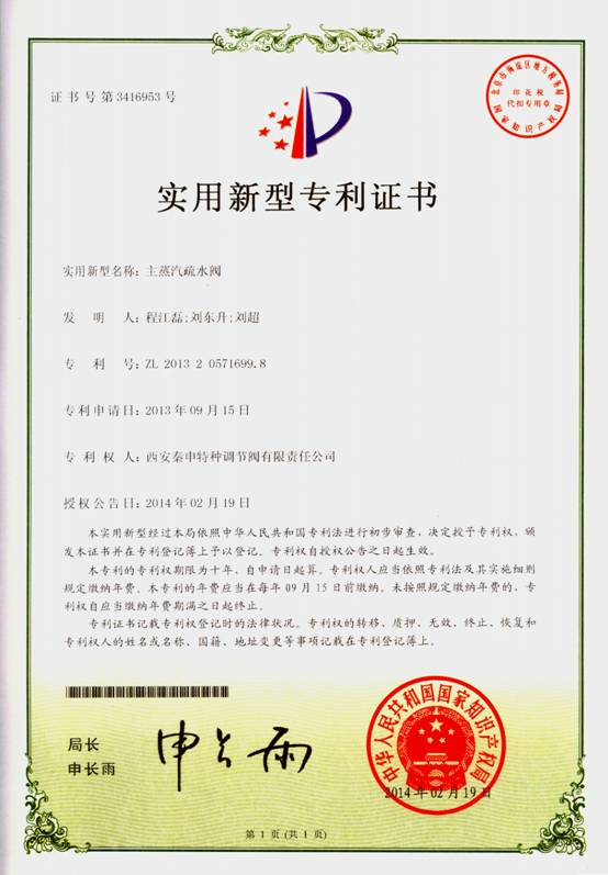 近期,我公司榮獲國家知識產(chǎn)權(quán)局頒發(fā)的實(shí)用新型專利證書5項(xiàng),具體為:《用于高溫高壓調(diào)節(jié)閥的閥套》、《高加危急疏水調(diào)節(jié)閥》、《一種先導(dǎo)式截止閥》、《一種高加危急疏水調(diào)節(jié)閥》、《主蒸汽疏水閥》。